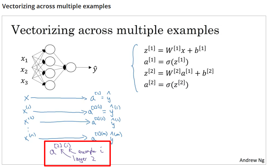 因此就表示 处于第一层的第四个神经元输出的关于第三个训练样本的激活向量(activation vector)