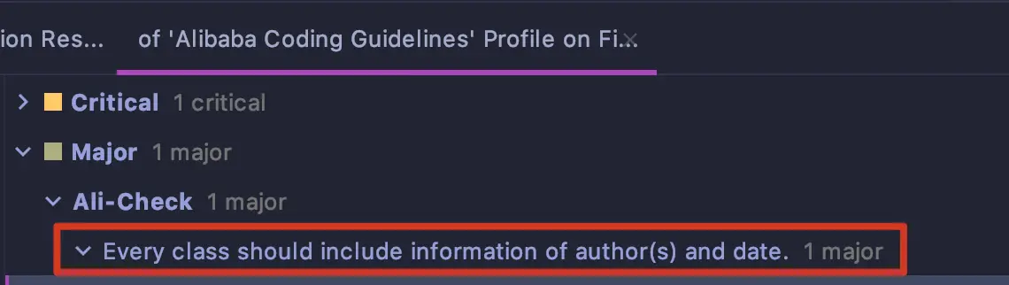 Javadoc 中的@author字段告诉我们自己是什么身份,我们是作者。如果类上没有标注日期和作者,alibaba代码检查工具会给出提示,就像这样: