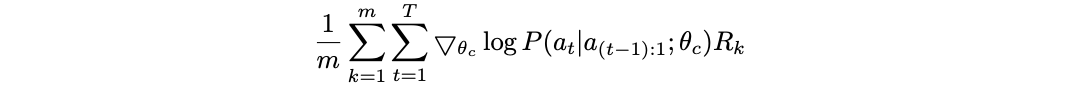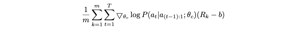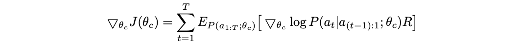 ,这里采用Williams的REINFORCE方法,通过多次采样来估算奖励期望进行梯度计算**(这里有懂强化学习的读者,可以留言讲解下这个公式)**