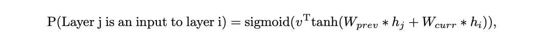 在层N添加一个anchor point隐藏层,该层输出N-1个content-based sigmoids来指示之前的层是否需要连接,代表构造的网络的第j层的anchor point,