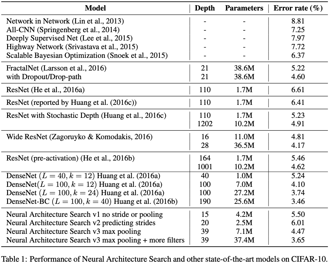 在训练了12800个网络后,得到了准确率最高的网络结构,之后进行小范围的超参数(learning rate,weight decay,batchnorm epsilon,epoch to decay learning rate)搜索,最后得到表1的结果:
