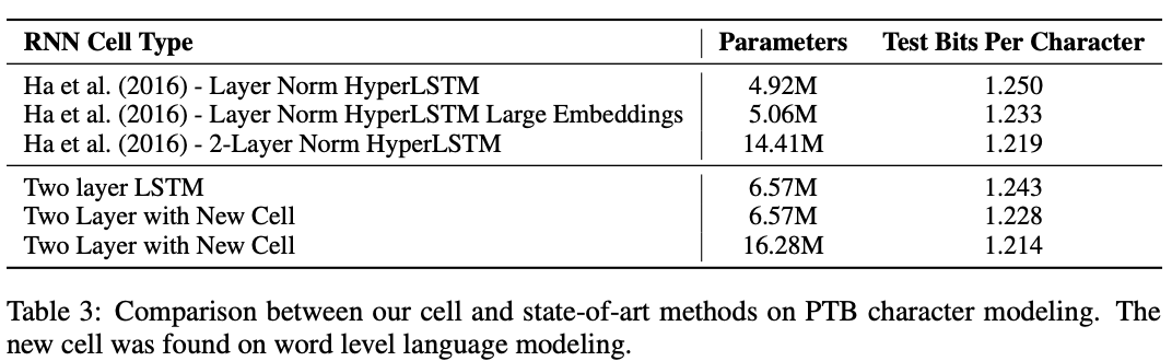 为了验证搜索的单元在不同任务上的通用性,在同样的数据集上进行character-level的实验,即字符预测,从结构看出,搜索的结构依然表现不错