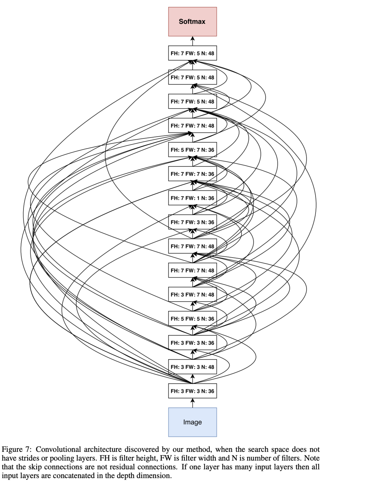 - 最后,在允许网络在13层和24层包含池化操作后,controller能够设计一个39-layer的网络,精度达到4.47%。为了缩小搜索空间,让模型预测13层网络,每层由全连接3层的3个子层构成(类似与densenet),此外,缩小卷积数量为