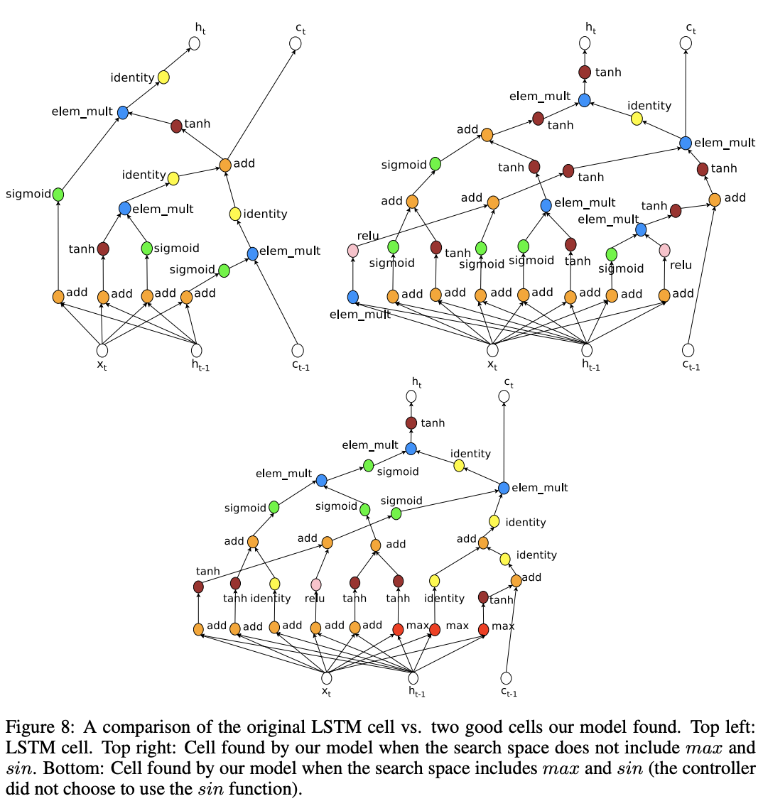 论文也在RNN架构搜索上进行了尝试,RNN和LSTM单元(cell)可以定义为一个树状结构,将和