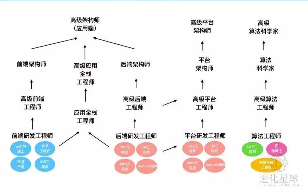 比较特殊的是算法这个大类下面, 数据挖掘、 NLP、 图像, 基本上是三个独立的方向, 因为算法工程师的工作和业务问题的类型强相关, 在某一个特定业务领域下积累的经验,并不能直接给到其他领域帮助, 只有走到高阶一览众山小,才可能达到一通百通。所以我特意用不同颜色标注出来。(算法这块并未穷尽所有可能,比如算法+平台的全栈, 未来有时间补上)