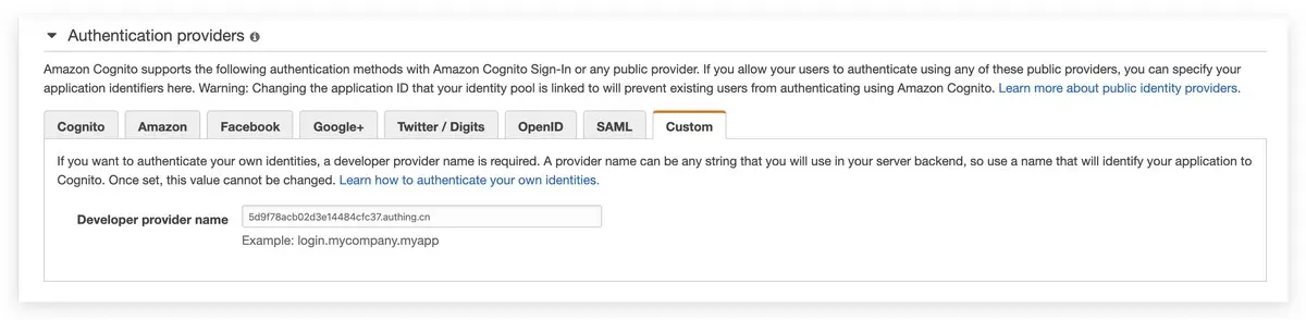 在创建 AWS Identity Pool 时,可以配置自定义 Authentication providers,这里我们将 Developer provider name 设置为 .authing.cn 格式: