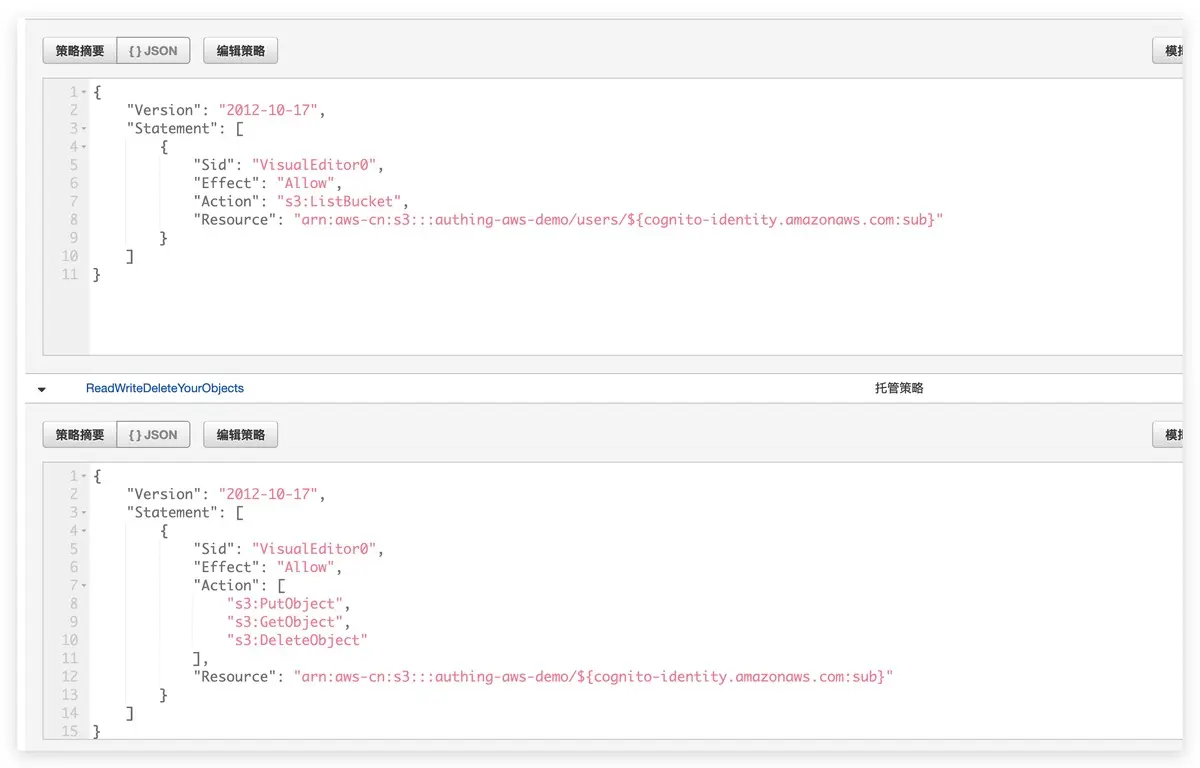 ${cognito-identity.amazonaws.com:sub} 会被替换成当前请求用户的 Cognito Identity Id。Statement ListYourObjects 让用户具备遍历 users/${cognito-identity.amazonaws.com:sub} 的权利,Statement ReadWriteDeleteYourObjects 让用户可以操作 users/${cognito-identity.amazonaws.com:sub} 下面的文件。