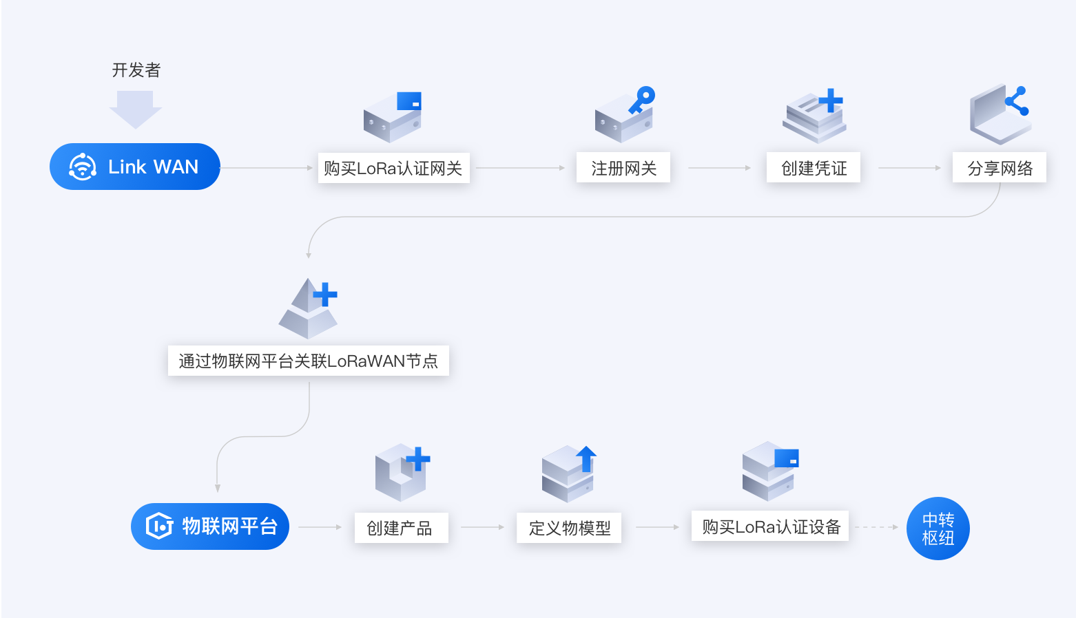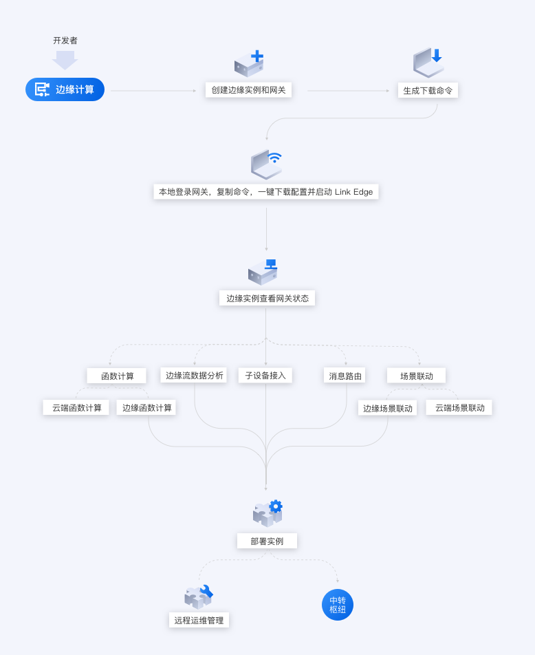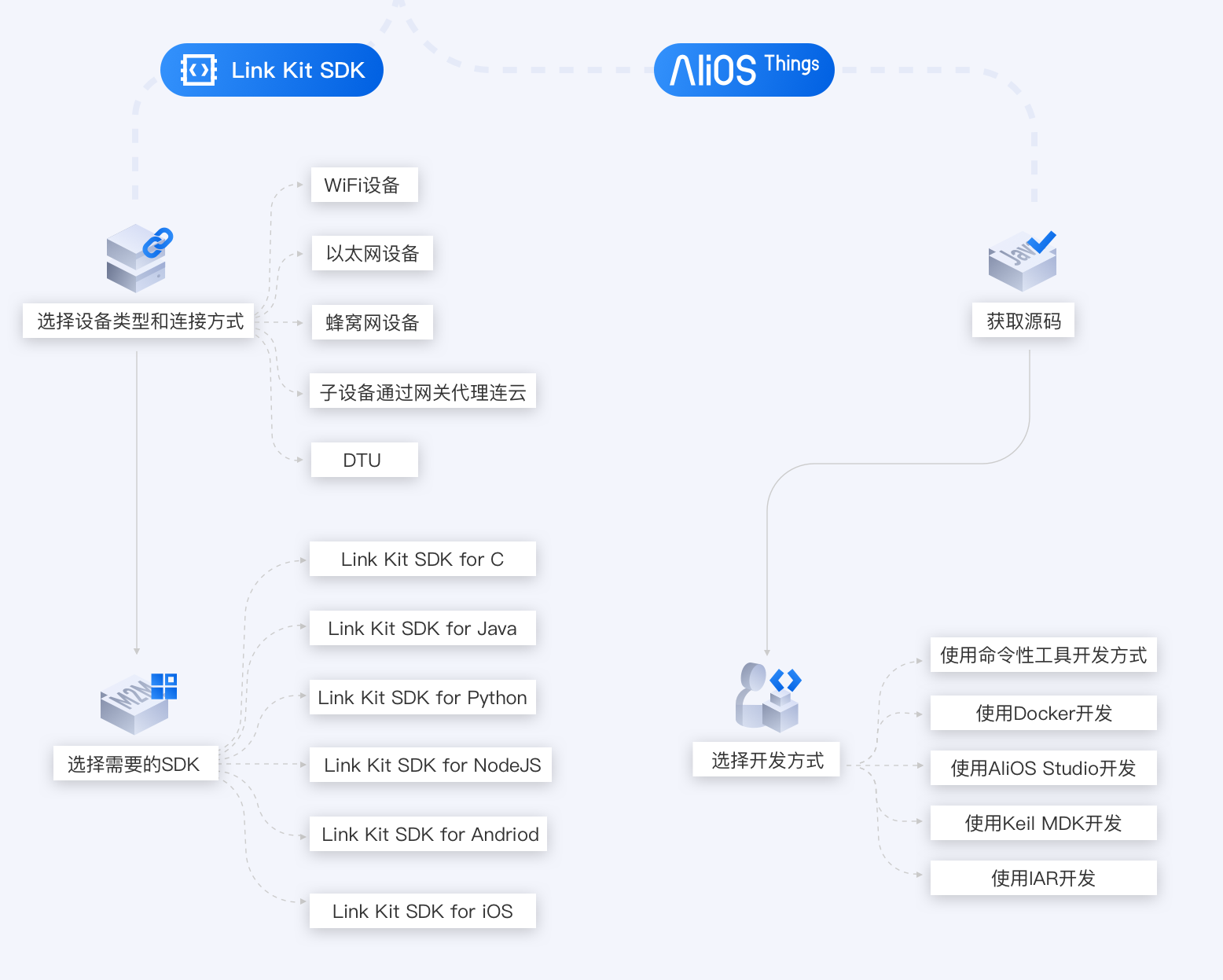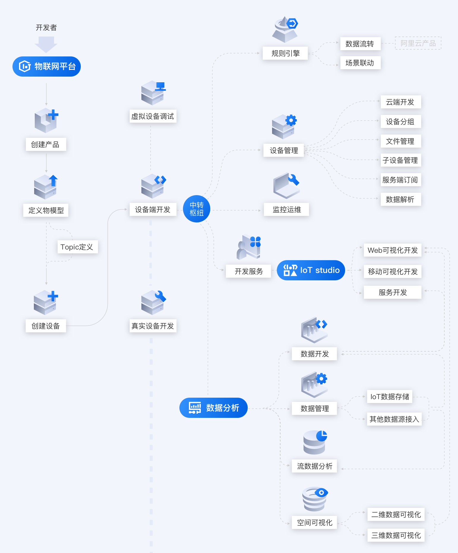 IOT设备连接上云 阿里云云栖号 2020-02-06 412 阅读2分钟 如何让我的设备连接上云?参考如下路径。云物联网平台创建产品定义物模型Topic定义创建设备设备端开发虚拟设备调试真实设备开发规则引擎数据流转场景联动设备管理云端开发设备分组文件管理子设备管理服务端订阅数据解析监控运维IoT StudioWeb可视化开发移动可视化开发服务开发数据分析数据开发数据管理IoT数据存储其他数据源接入流数据分析空间可视化二维数据可视化三维数据可视化端Link Kit SDK选择设备类型和连接方式WiFi设备以太网设备蜂窝网设备子设备通过网关代理连云DTU选择需要的SDKCJavaPythonNodeJSAndroidiOSAliOS Things获取源码选择开发方式使用IAR开发使用Keil MDK开发使用AliOS Studio开发使用Docker开发使用命令性工具开发管Link WAN购买LoRa认证网关注册网关创建凭证分享网络通过物联网平台关联LoRaWAN节点物联网平台创建产品定义物模型购买LoRa认证设备边创建边缘实例和网关生成下载命令本地登录网关,复制命令,一键下载配置并启动Link IoT Edge边缘实例查看网关状态子设备接入函数计算云端函数计算边缘函数计算边缘流数据分析消息路由场景联动边缘场景联动云端场景联动部署实例远程运维管理上云就看云栖号,点此查看更多!本文为阿里云原创内容,未经允许不得转载。