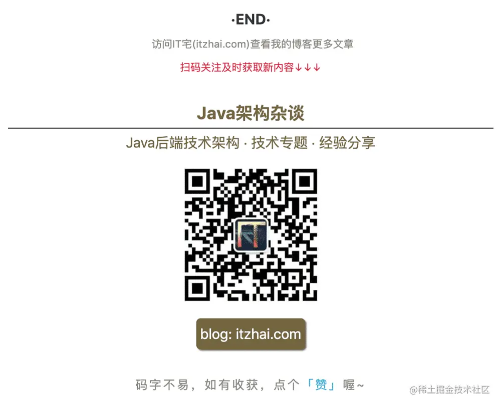 大家可以关注我的博客:itzhai.com 获取更多文章,我将持续更新后端相关技术,涉及JVM、Java基础、架构设计、网络编程、数据结构、数据库、算法、并发编程、分布式系统等相关内容。