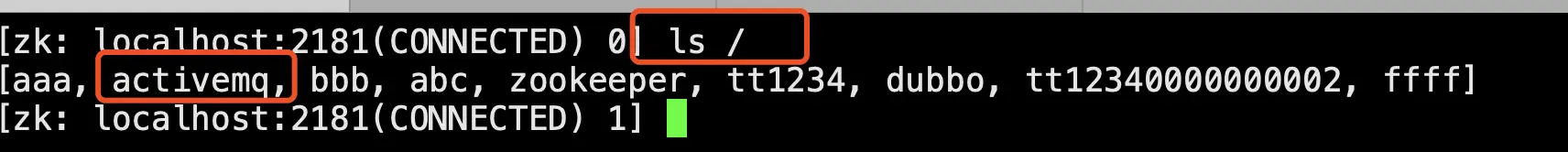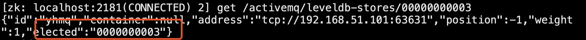 上图表示有三台ActiveMQ节点被挂在到Zookeeper。通过get命令查看节点信息.下图所示不为null,表示该节点为ActiveMQ的Master,其余两个为null表示为Slave