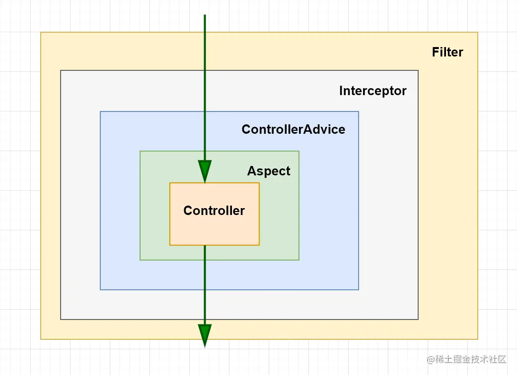 Aspect、ControllerAdvice、Intercepter 都是 SpringMVC 框架中的概念。而 Filter 是 Servlet 规范中的,与具体实现框架无关。