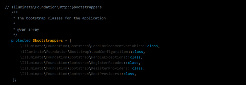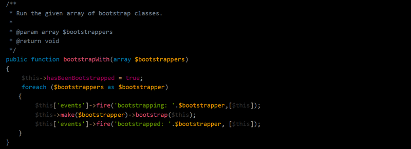重点代码在 $this['events']->fire('bootstrapping: '.$bootstrapper, [$this]); 和 $this['events']->fire('bootstrapped: '.$bootstrapper, [$this]); 上,很明显是加载并运行 bootstrapper 的前置和后置事件。