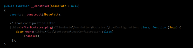 我们在创建了 ZhiyiPlusBootstrapLoadConfiguration 这样一个类,注册为后置事件,路径为: /app/Bootstrap/LoadConfiguration.php ,然后实现代码如下: