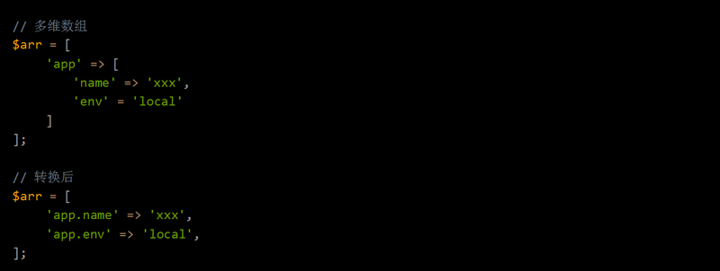 为什么要特殊说一下这个方法?因为这个方法的特殊性,也是 depth merge 实现的重要函数,在 Repository 中支持 app.name = value 这样的形式进行深曾键值赋值,利用这一个特性,这个函数将 多维数组转换为一维。