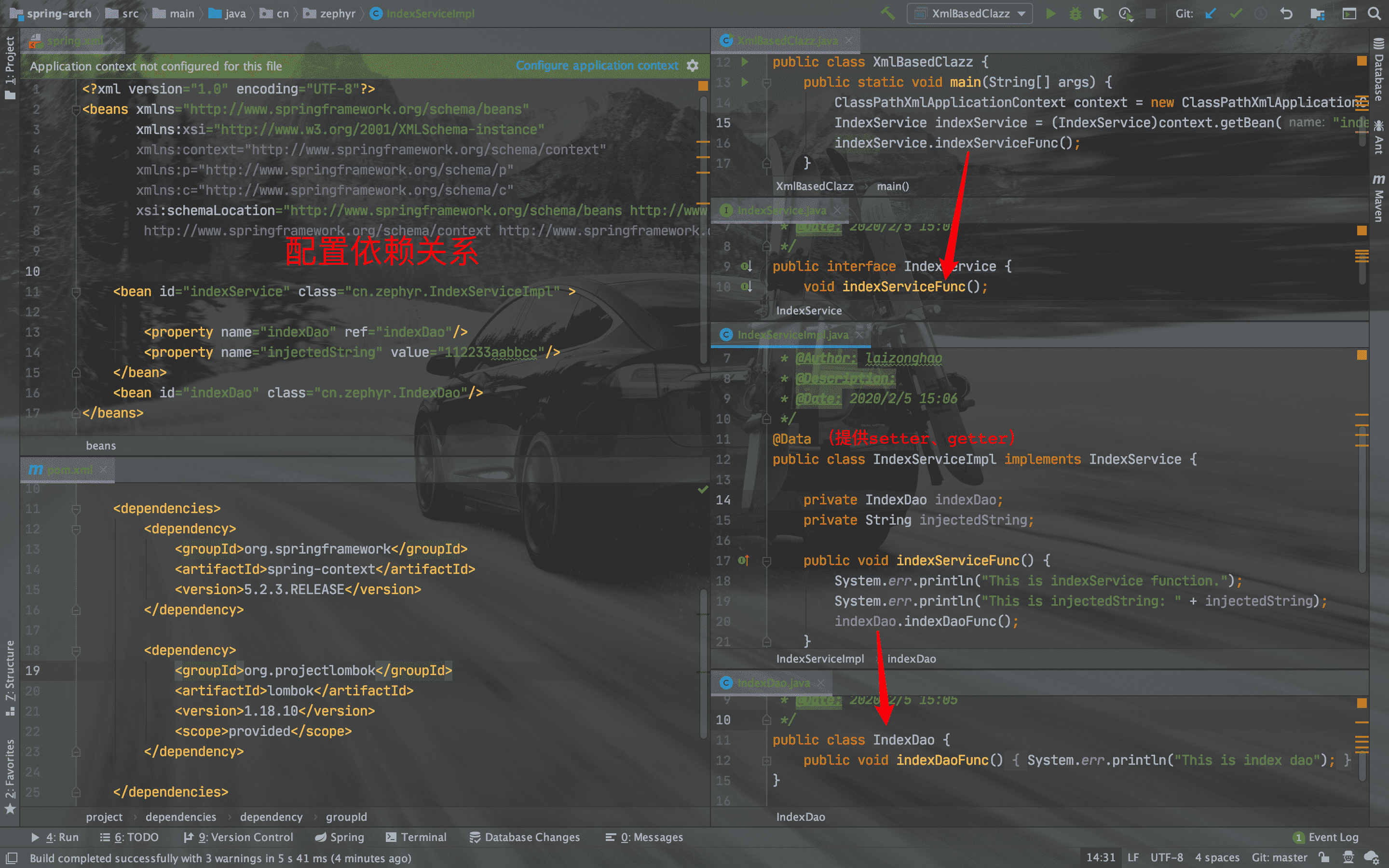 <bean id="indexService" class="cn.zephyr.IndexServiceImpl" > <constructor-arg name="indexDao" ref="indexDao"/> <constructor-arg name="injectedString" value="112233aabbcc"/> </bean> <bean id="indexDao" class="cn.zephyr.IndexDao"/> - 在