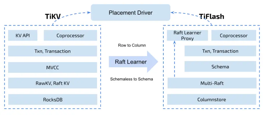 架构上,TiFlash 是一个提供与 TiKV 类似功能的存储层模块,它使用 Raft Learner(etcd.io/docs/v3.3.1…)进行数据传输并转存为列存。这意味着,TiFlash 节点的状态和延迟,不会影响 TiKV 的运行,哪怕 TiFlash 节点崩溃,TiKV 也能毫无影响地运行;另一方面也可以提供最新(线性一致 + 快照隔离),和 TiKV 一致的数据。