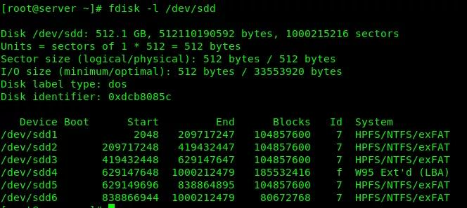 使用fdisk -l /dev/sdd查看硬盘设备(注意:sdd是笔者清楚系统有3块硬盘+1块移动硬盘得知的。一般而言,设备名是sd前缀,后缀是根据第1~4块盘,按a,b,c,d...的顺序命名),发现是此前是在Windows环境进行分区的,采用的是NTFS的文件系统(如下图所示)。