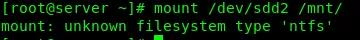 如不清楚系统是否已经支持NTFS文件系统,可尝试手动挂载。要从第二个分区拷贝数据,可执行mount /dev/sdd2 /mnt/,如成功则没有提示;如失败则有提示(如下图所示,mount: unknown filesystem type 'ntfs' ,表示没有支持NTFS文件系统,需要新安装NTFS驱动)。