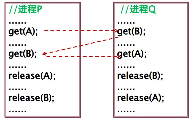 如下图:A、B分别代表某种资源,假设都只有一个,进程P先占用了资源A,接着进程Q占用了资源B,后面进程P再想要资源B就拿不到,进程Q想要资源A也拿不到,系统就陷入死锁状态了。