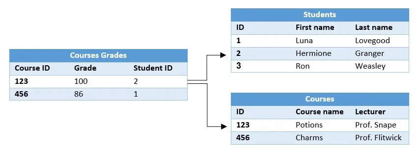为什么叫关系型? 在这种数据库中存在的“关系”是什么? 假设您有一个学生信息表和一张课程成绩表(课程,成绩,学生证),每个成绩行都与学生信息表的一条记录相关。 参见下图,课程成绩表中 “Student ID” 列的值通过 “ID” 列的值指向 “Students” 表中的行。