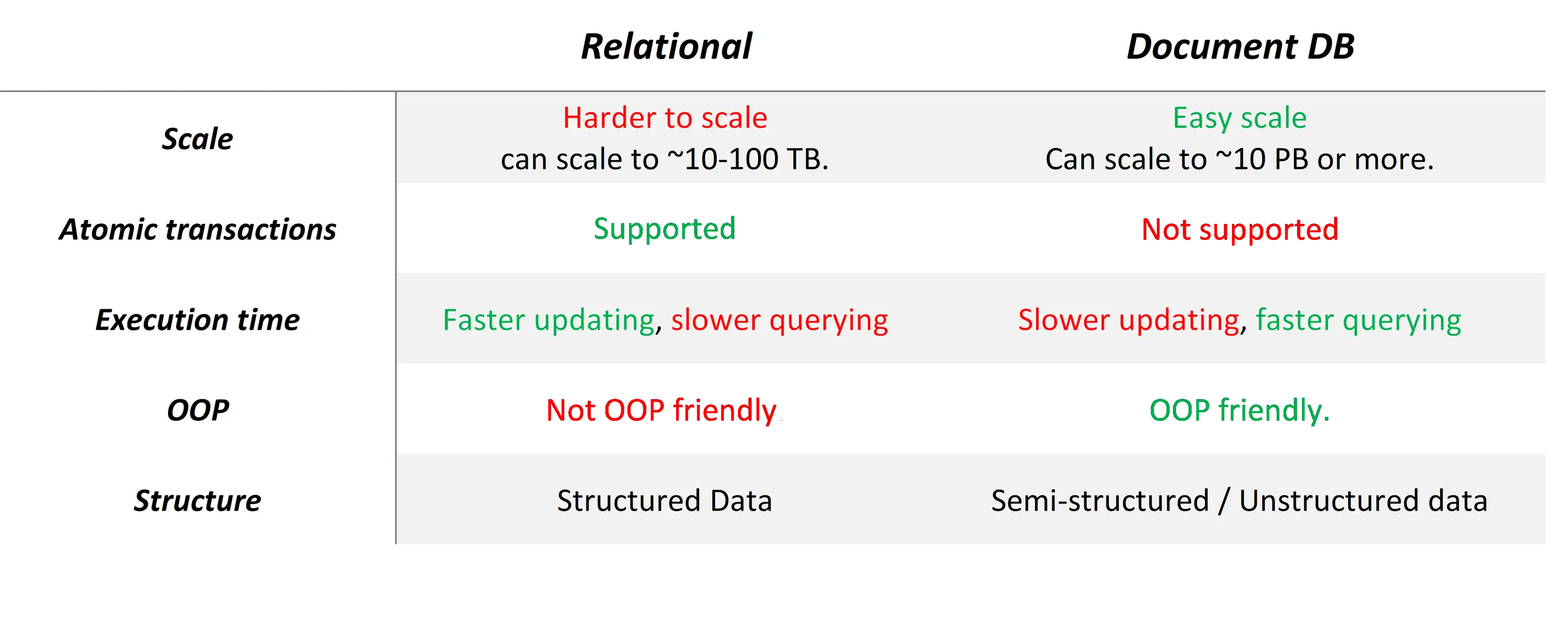 您现在可能已经知道了答案了,这个问题没有标准答案,没有一个数据库能够解决所有的问题。 我们通常使用的是最常见的关系型数据库和文档存储数据库,因此我们将对它们二者进行比较。