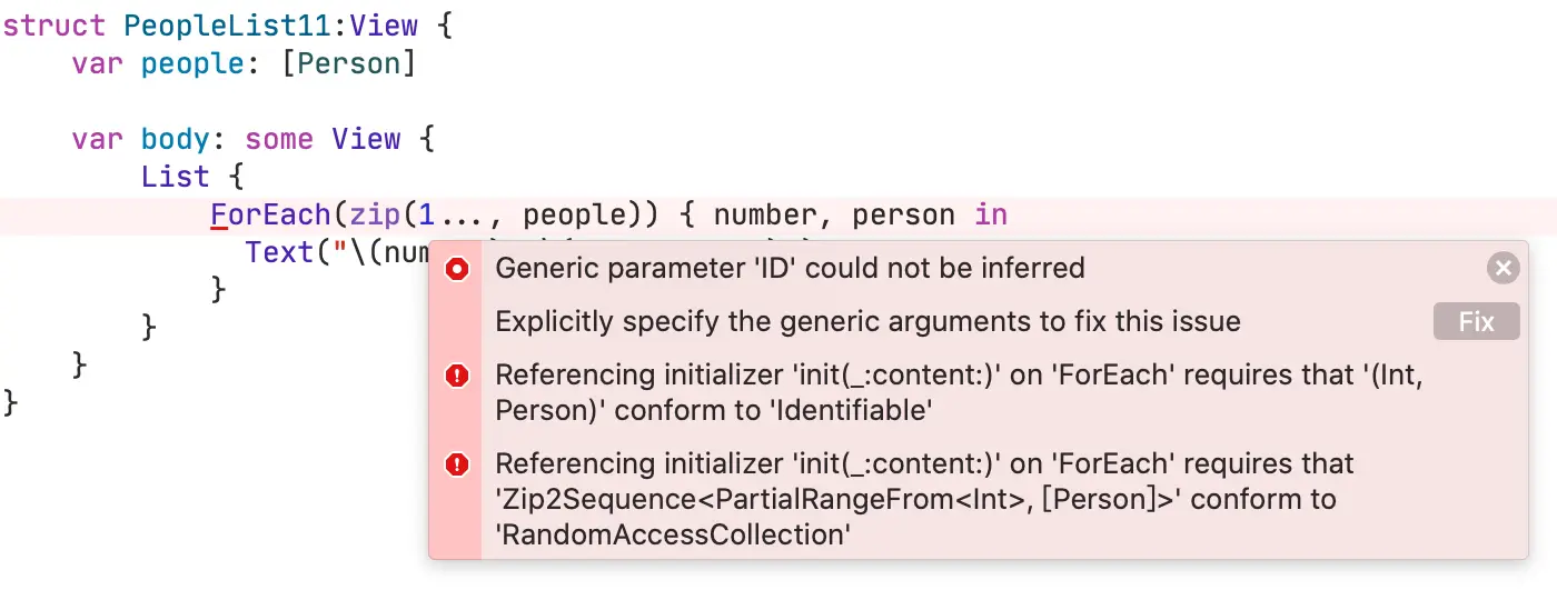 ForEach必须是一个randomaccesscollection,但是zip产出的是一个Sequence。 我们通过zip过的序列转换回数组来fix。 - 序列的元素类型,(Int, Person)不遵循