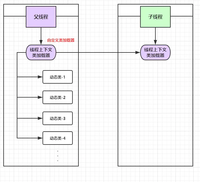 只要有大量热加载和卸载动态类的场景,就需要警惕后代线程ContextClassLoader设置不当导致内存泄漏。画个图就能比较清楚: