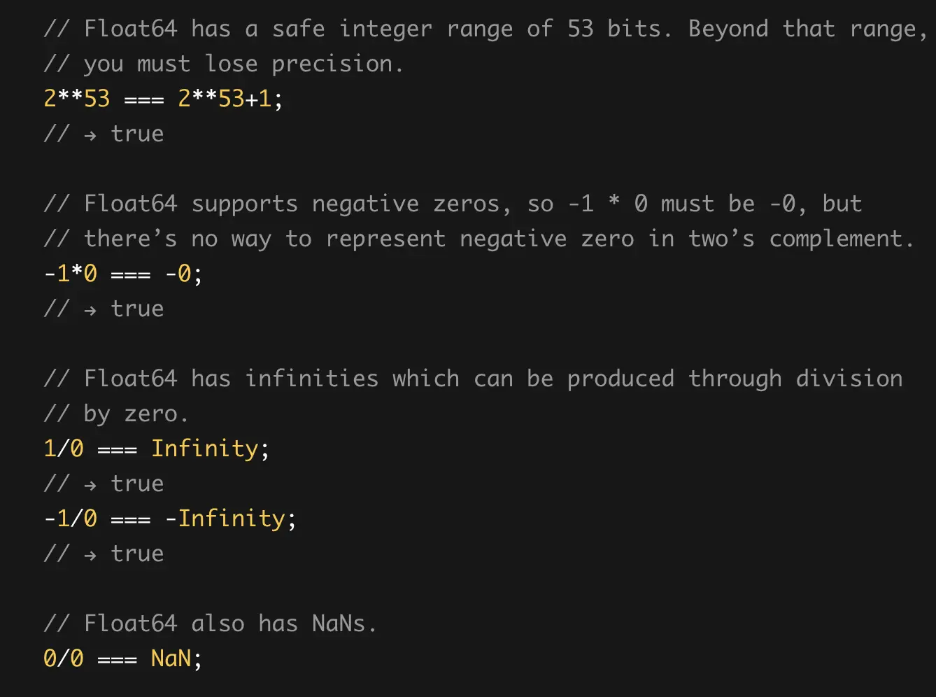 由于整数运算通常比浮点运算执行得快得多,因此似乎引擎可以始终对所有整数和整数运算的所有结果使用二进制补码。不幸的是,那将违反ECMAScript规范!ECMAScript在Float64上实现了标准化,因此某些整数运算实际上会产生浮点数。在这种情况下,JS引擎产生正确的结果很重要。