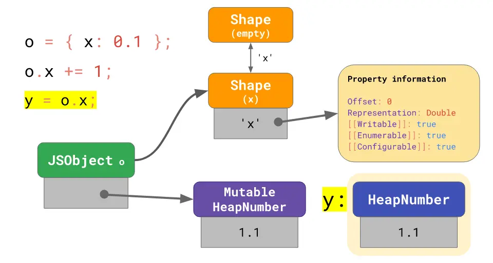 HeapNumber类型是不可变的,因此可以进行某些优化。例如,如果我们将y的值分配给x: