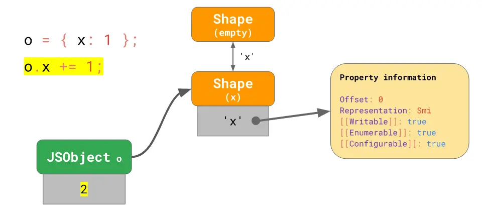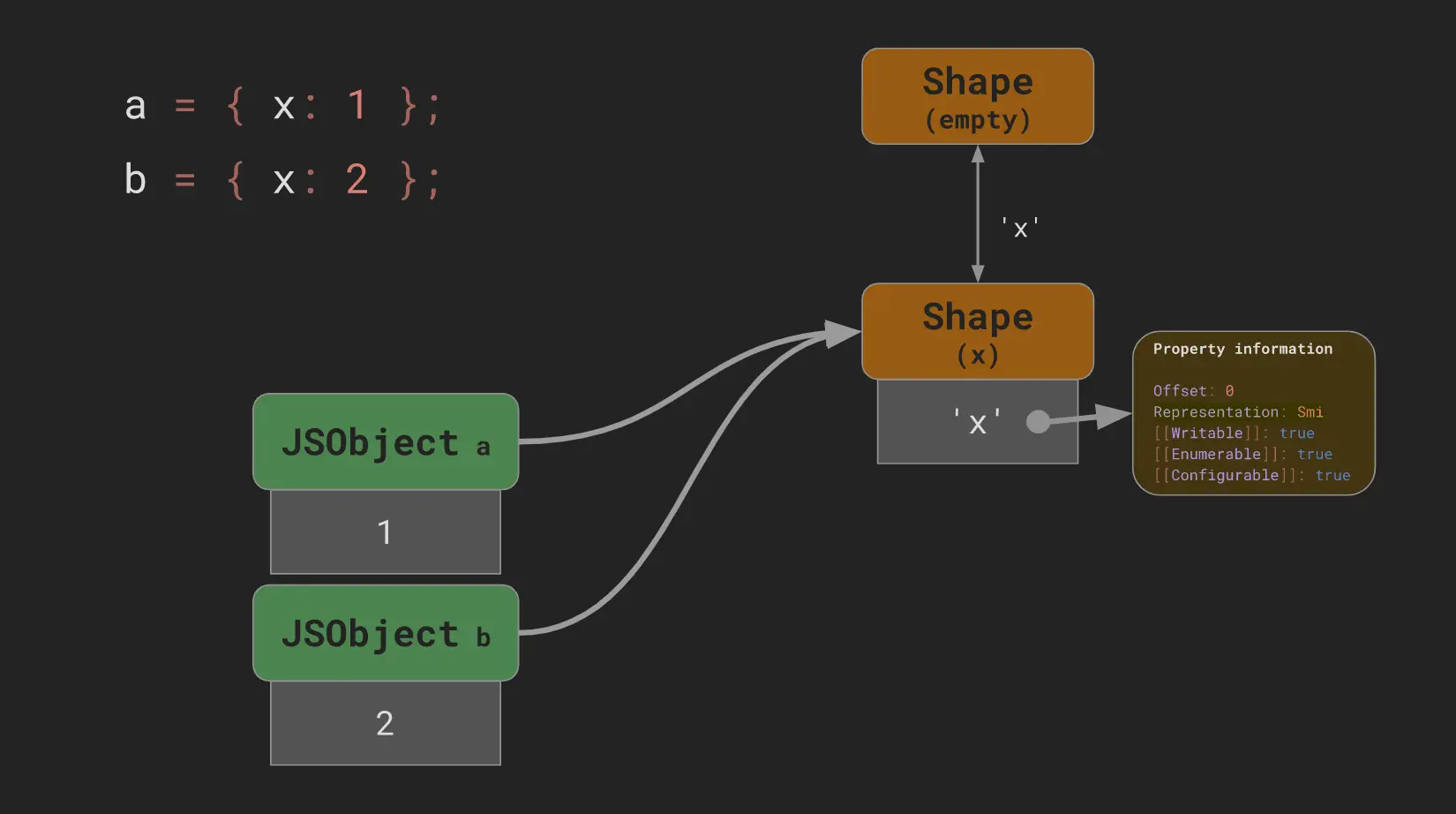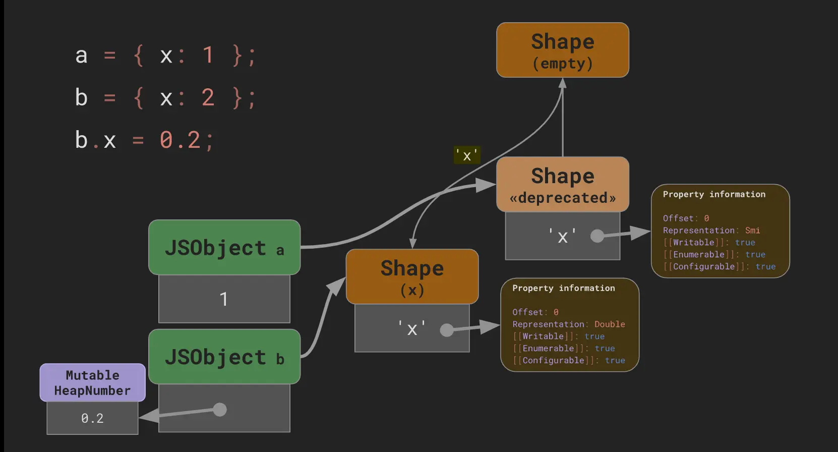 像在这种情况下,两个对象都使用相同的Shape,其中属性x最初表示为Smi类型