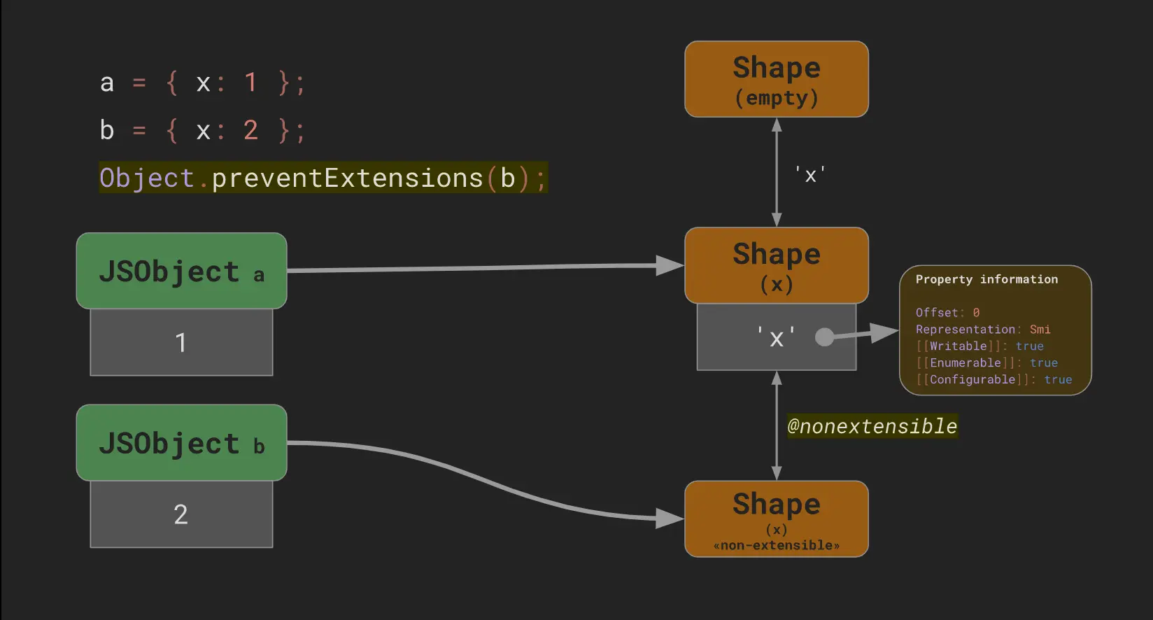 它开始时就像我们已经知道的那样,从空的形状过渡到容纳该属性的新形状'x'(表示为Smi)。当我们阻止对的扩展时b,我们将执行特殊过渡到标记为不可扩展的新形状。这种特殊的过渡不会引入任何新属性,实际上只是一个标记。