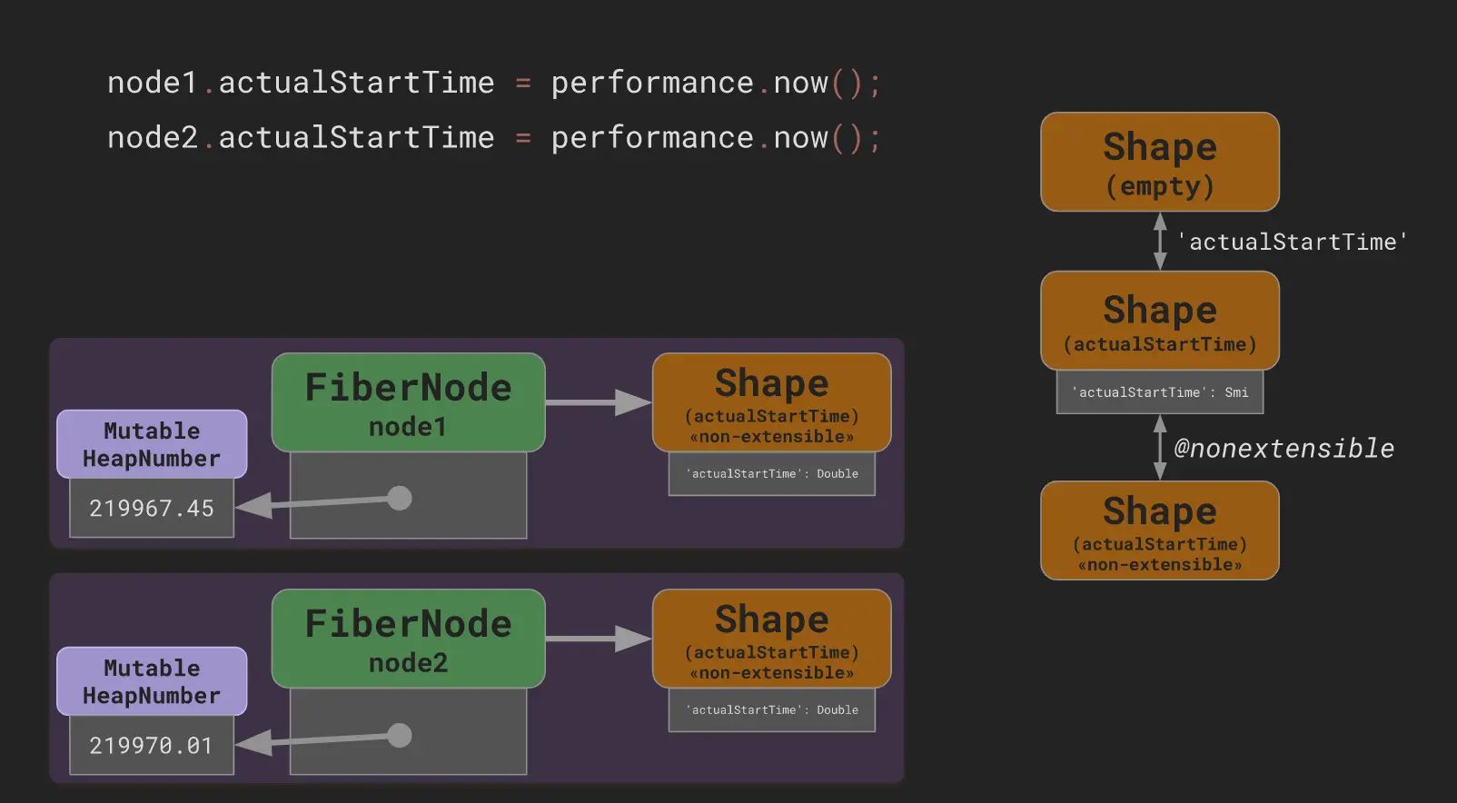 这些字段(例如actualStartTime)使用0或初始化-1,因此以Smi表示形式开始。但后来,来自的实际浮点类型的时间戳performance.now()存储在这些字段中,导致它们变为Double表示形式,因为它们不适合Smi。最重要的是,React还阻止了FiberNode实例的扩展。