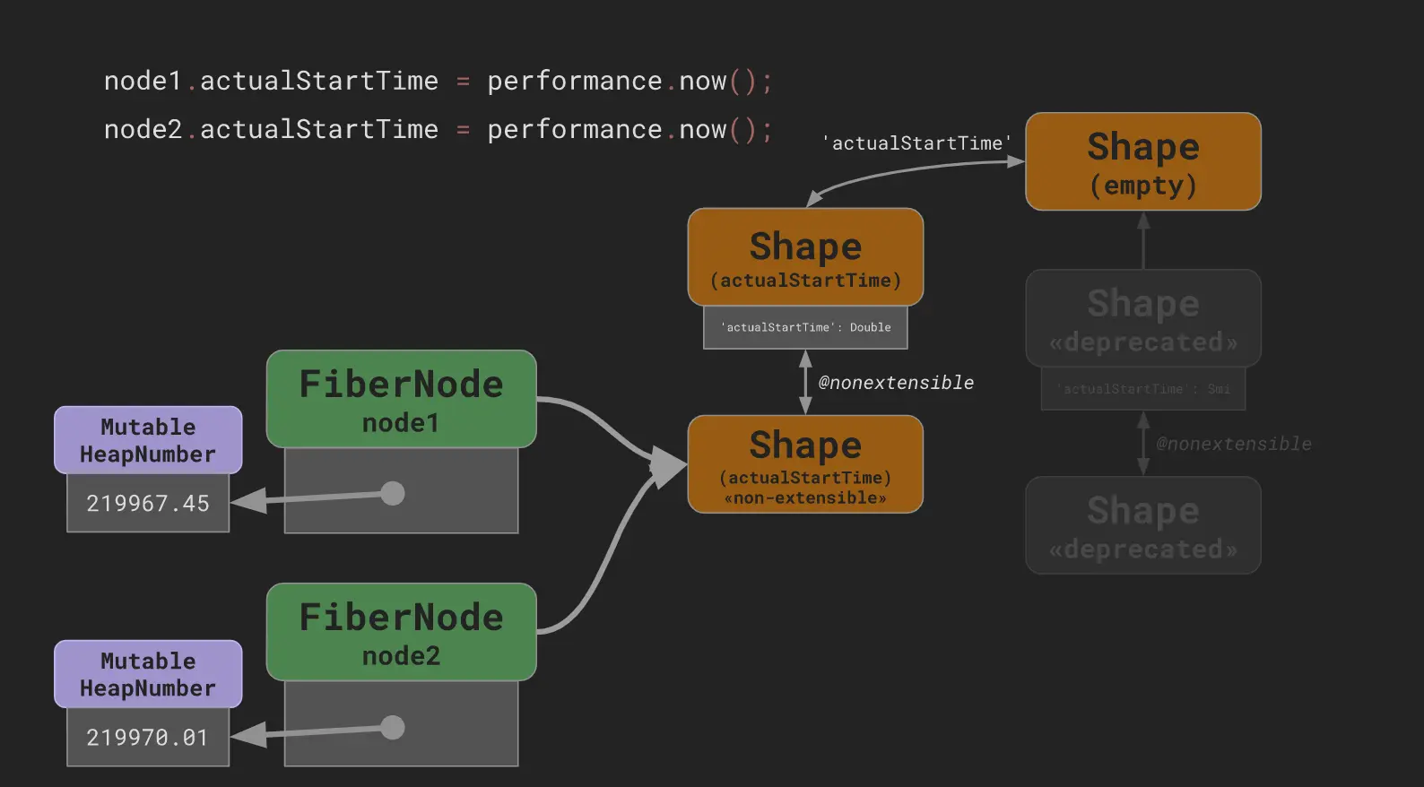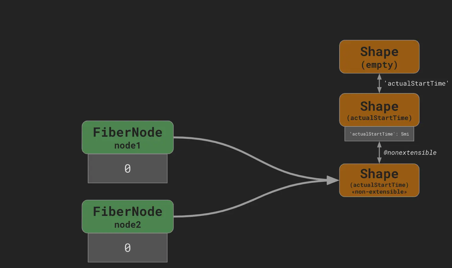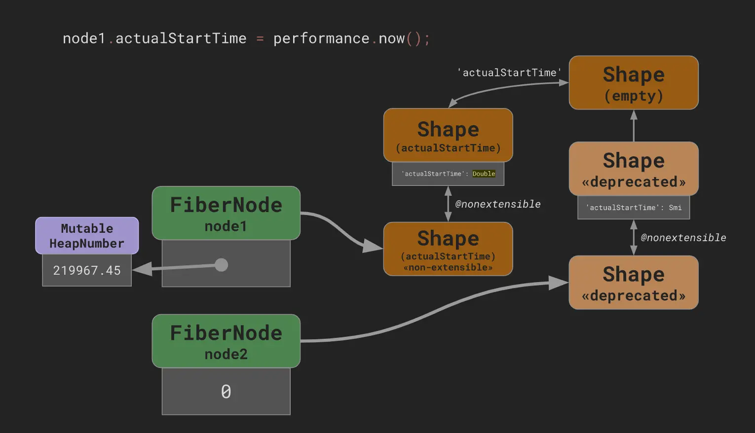 两个FiberNode实例指向不可扩展Shape,其中'actualStartTime'是一个Smi字段。当第一个任务node1.actualStartTime发生时,将创建一个新的过渡链,并将前一个链标记为已弃用: