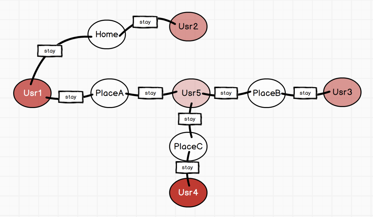 Usr1 确诊之后,我们需要查看她在哪些时候到过哪些地方。而对应这个时间段相同地点内,又有哪些人同她接触。 我们判断这些亲密接触者,需要重点隔离和观察。
