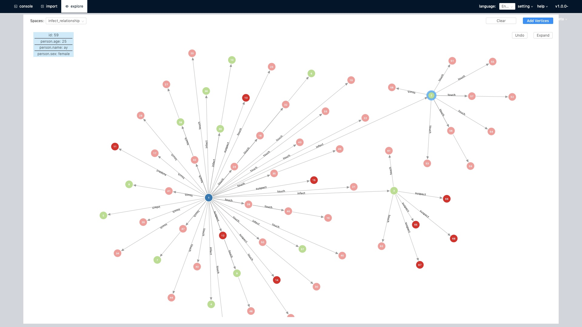 INSERT VERTEX person(ID, HealthStatus, SickTime) VALUES 1:(2020020201, ‘Sick’, '2020-01-24');