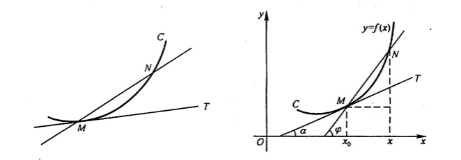 如上图所示,我们可以在选择另外一个点N,然后做MN的割线。假设T是M的真实的切线,当我们将N向M无限逼近的时候,在无限缩小,直到趋近与0,而此时的割线MN也就无限逼近于M点真实的切线T。