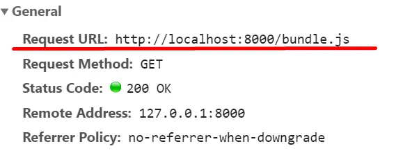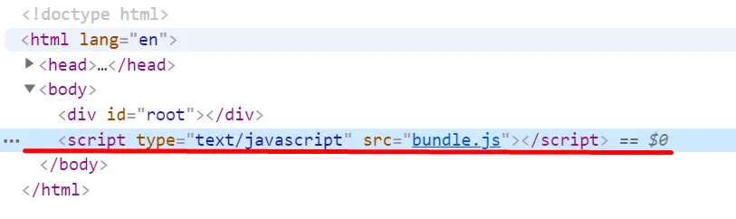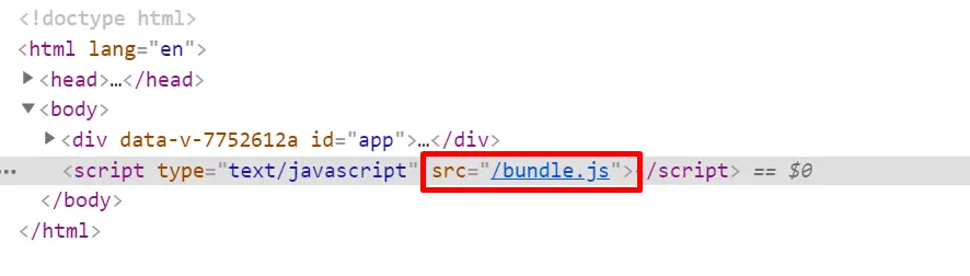 于是我们可以发现问题所在,如图所示,webpack帮我们打包js代码后自动在index.html引入方式为src="bundle.js",即相对路径./bundle.js 。