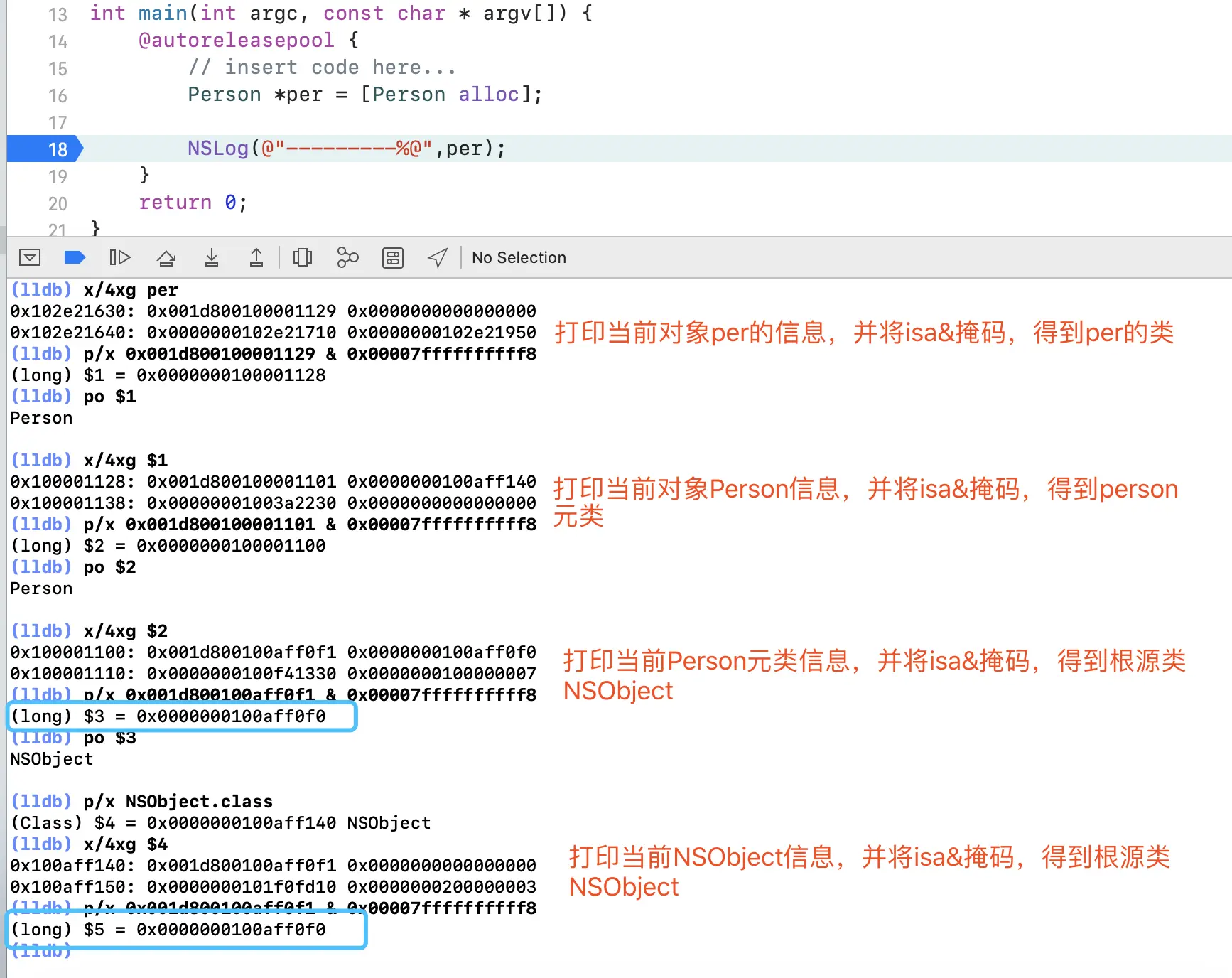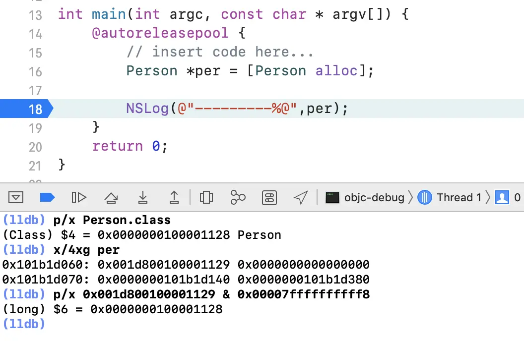 3、p/x 0x001d800100001129 & 0x00007ffffffffff8:我们用isa的地址&掩码,就得到了我们第一行的地址。由此可见,isa&掩码之后就和类关联起来了。