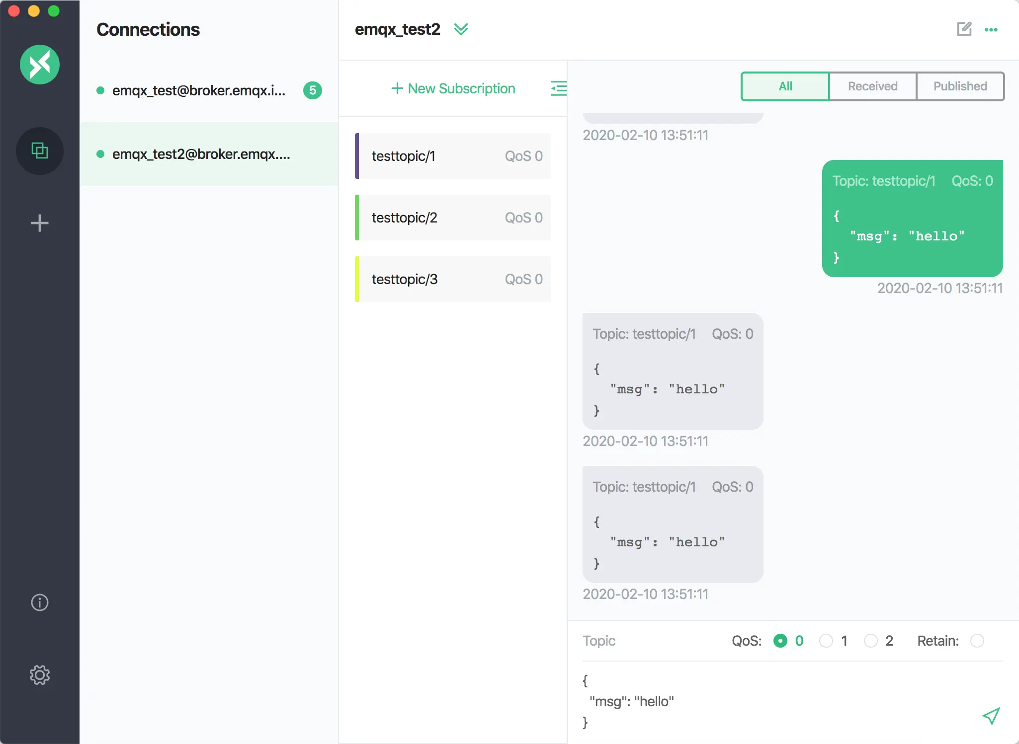 MQTT X 是由全球领先的开源物联网中间件提供商 EMQ 开源的一款跨平台 MQTT 5.0 桌面客户端,它支持 macOS,Linux,Windows。MQTT X 的用户界面借助聊天软件的形式简化了页面的操作逻辑,用户可以快速创建连接保存并同时建立多个连接客户端,方便用户快速测试 MQTT/TCP、MQTT/TLS 的连接、发布/订阅功能及其他特性。