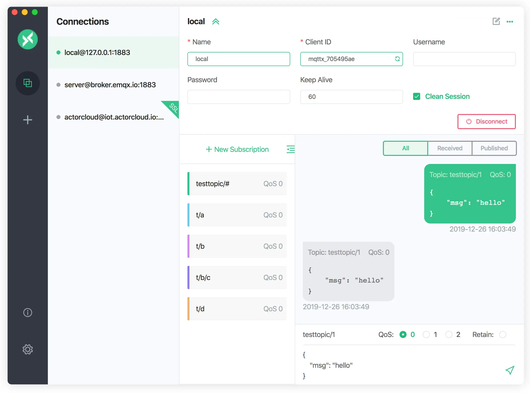 MQTT X 是新推出的产品,采用了 Electron 跨平台技术,界面美观且资源占用较低,MQTT X 在交互上一改常见的单一客户端模式,允许保存多个连接信息;