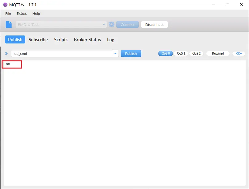 在mqtt.fx中下发一条开启命令: