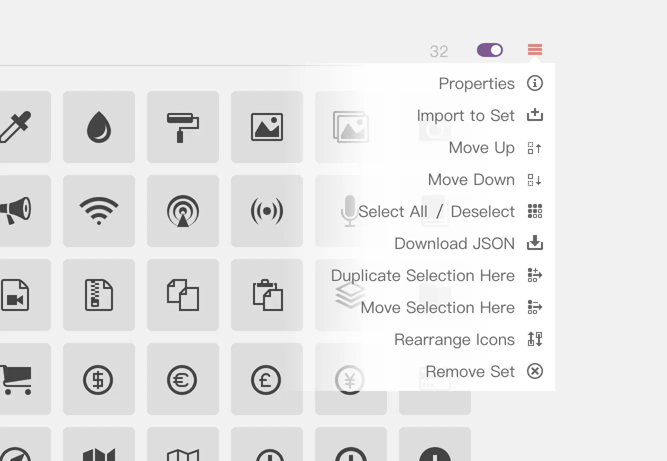 这里主要介绍icon-finder的由来.正如文章开始提到的,笔者采用icomoon作为图标库, 我们可以在其官网上定制自己的图标,笔者大概选了40多了免费图标,项目中使用基本够用了.主要介绍一下他的具体功能: