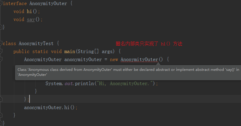 其中,new AnonymityOuter() 之后的 {...} 大括号包含的部分就为匿名内部类。