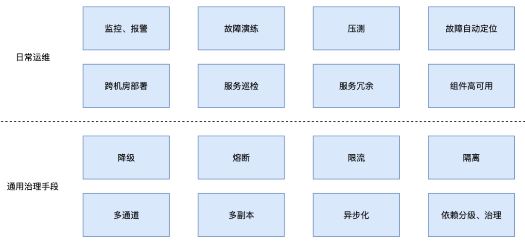 治理手段方面,借助降级、熔断、限流、隔离、多通道、多副本等手段对核心资源进行治理。