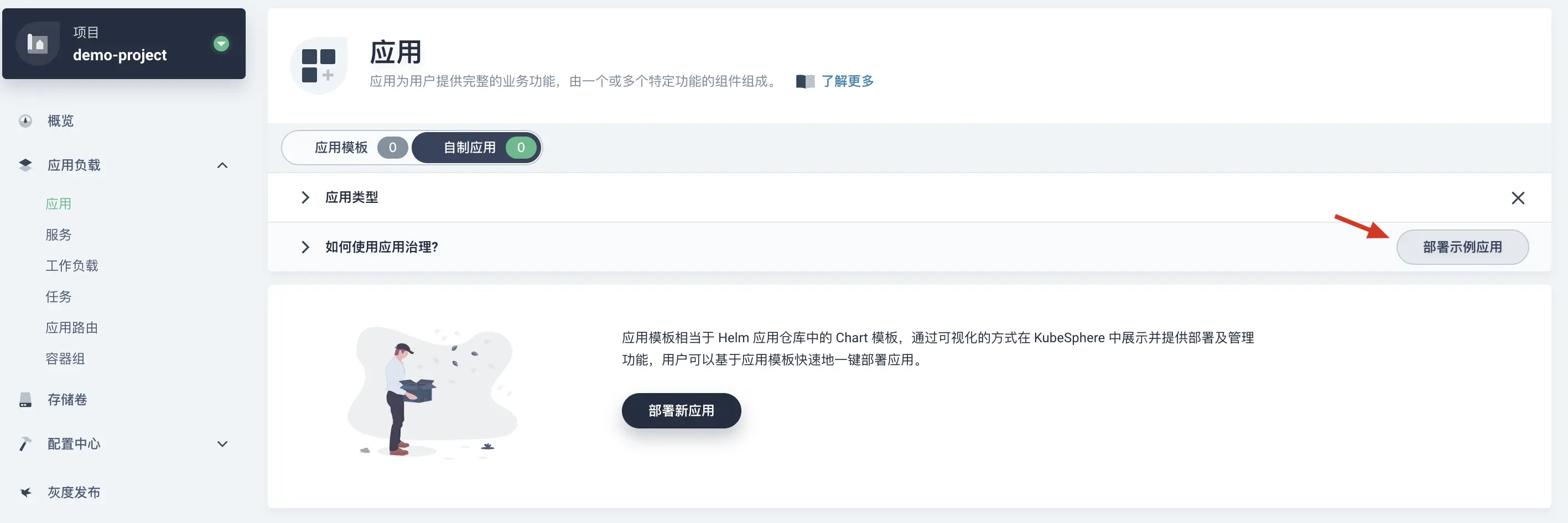 project-regular账号进入项目 demo-project 后,选择应用负载→应用,点击 「部署示例应用」。