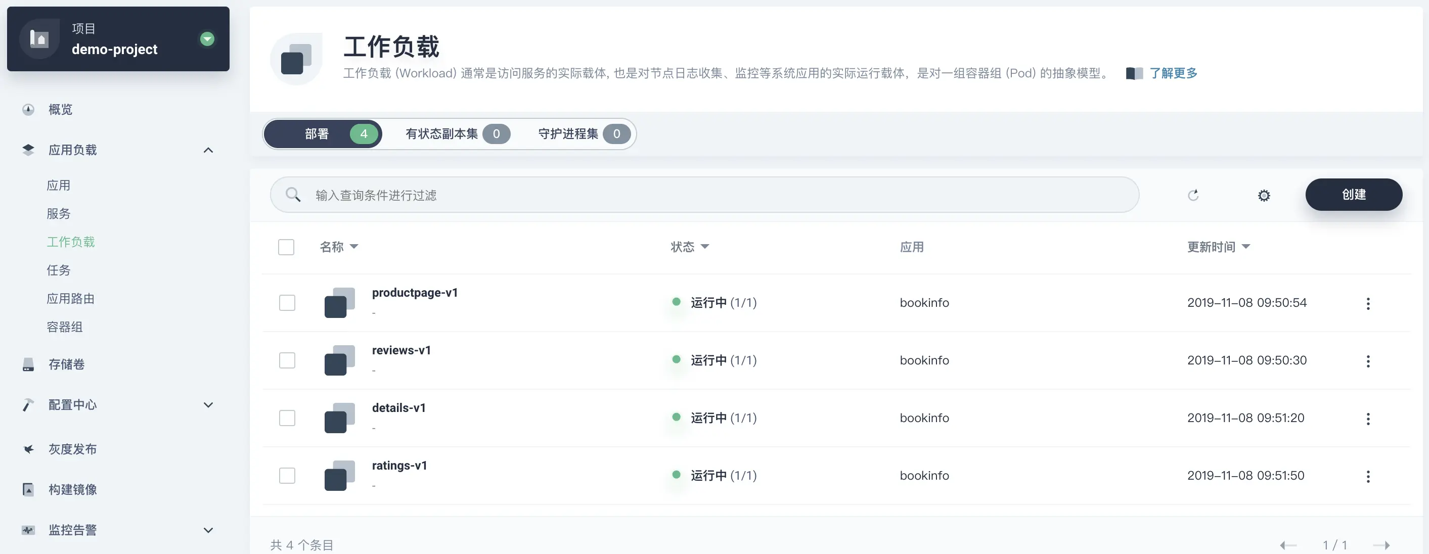 运行中,则说明 bookinfo 微服务创建成功(约 2 分钟)。