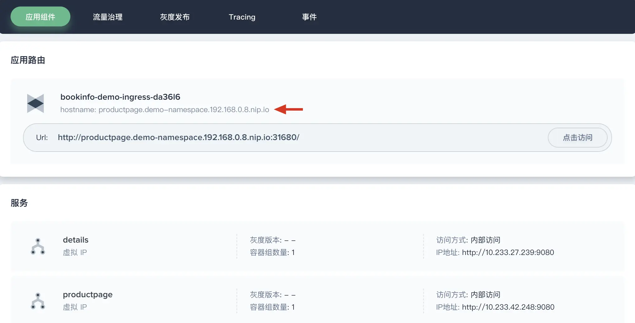 - 点击 bookinfo 进入应用详情页,可以看到应用路由下自动生成的 hostname。