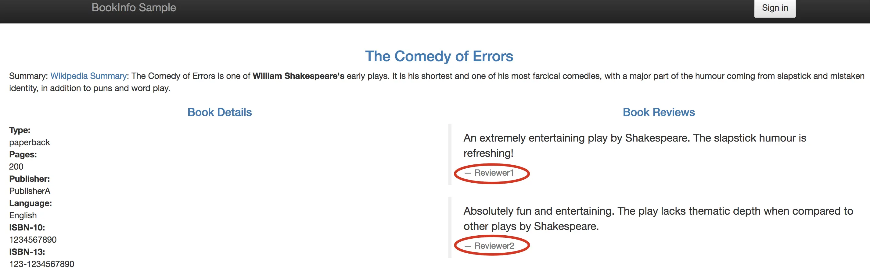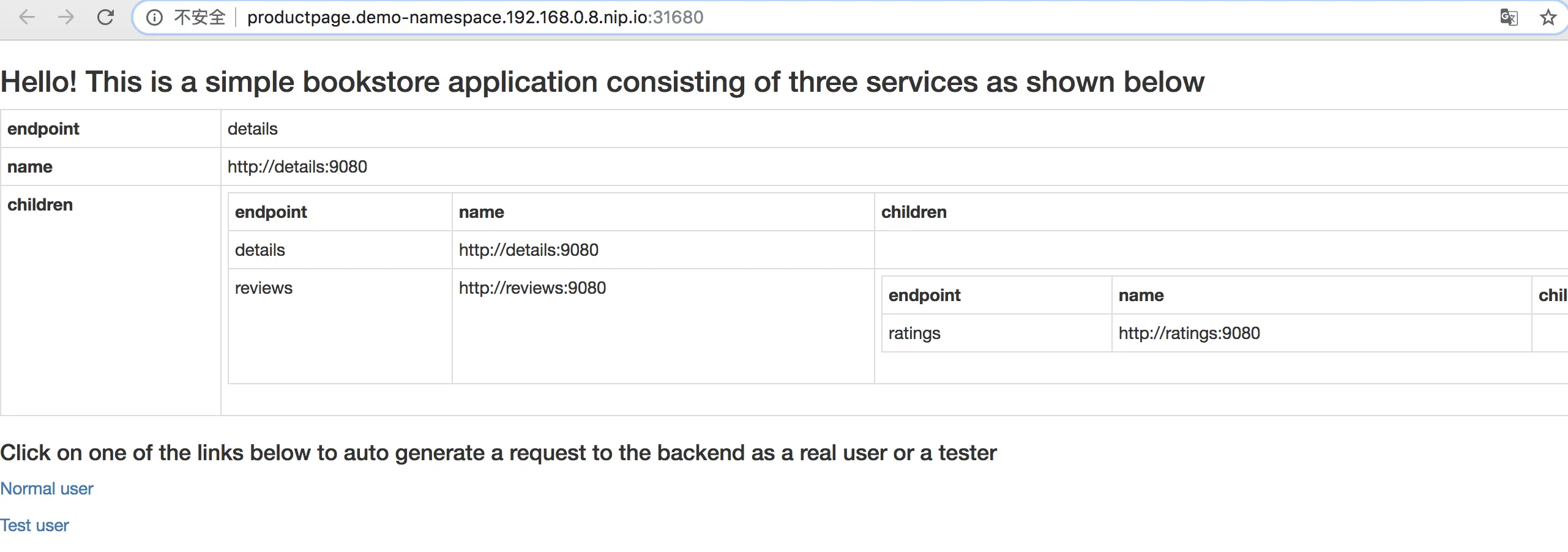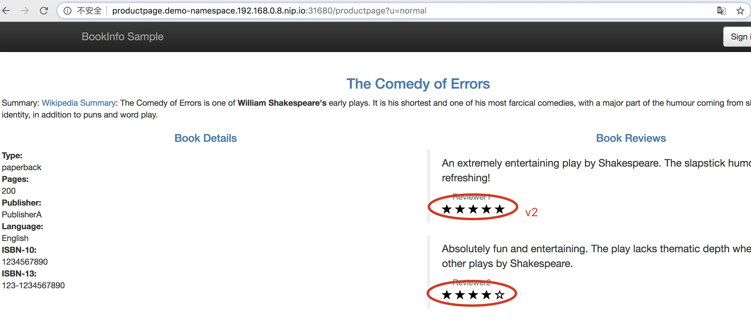 - 点击 Normal user 访问 productpage。注意此时 Book Reviews 部分只显示了 Reviewer1 和 Reviewer2。