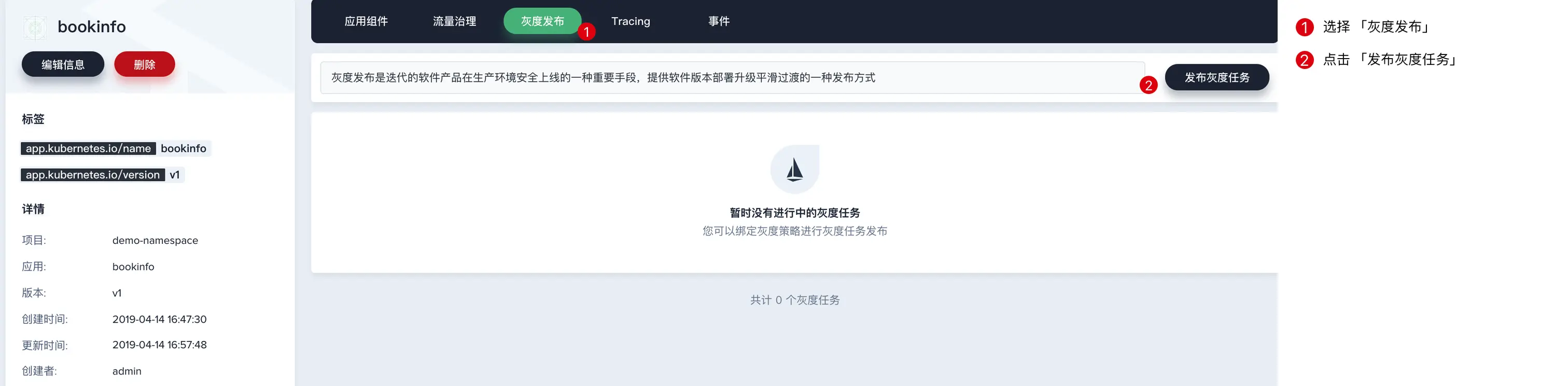 - 回到 KubeSphere,选择 「灰度发布」,点击 「发布灰度任务」。