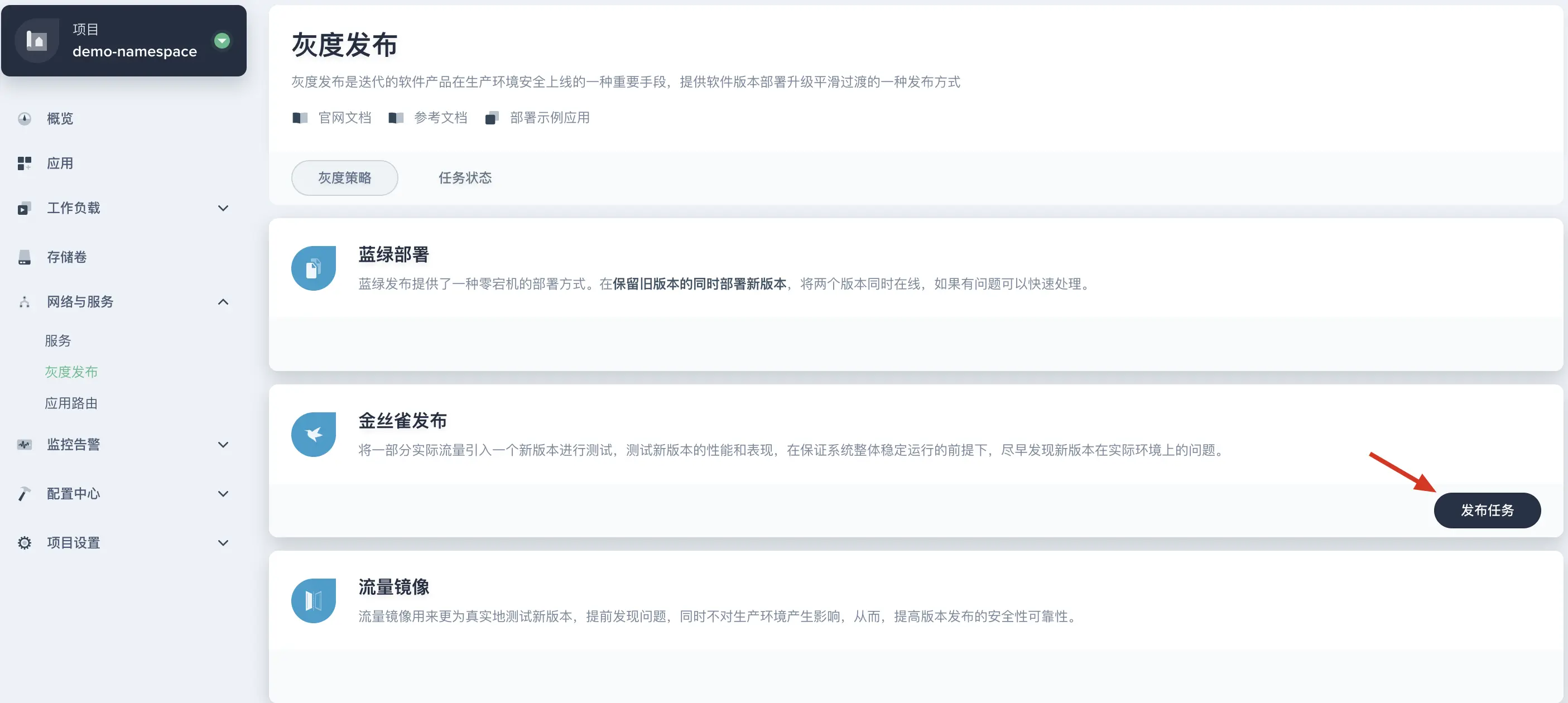 - 在跳转的灰度发布页面,选择 「金丝雀发布」 作为灰度策略,点击 「发布任务」。